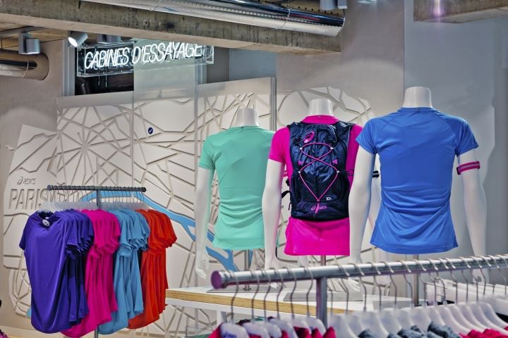 Perlengkapan baru termasuk tabel yang menampilkan berbagai celana ketat, atasan, dan pendek, yang dirancang untuk membawa tinggi ke ruang lantai dan untuk mempromosikan penawaran produk yang luas ini dengan potensi penuh mereka. Mereka juga memungkinkan narasi cerita produk yang menarik dan berbeda dari lantai ke dinding untuk pelanggan. Di bagian belakang toko ada dinding fitur tampilan dinamis baru yang dikurung untuk memamerkan cerita produk terbaru. Fitur lainnya termasuk area tampilan The Anatomy of a Running Shoes,'' menunjukkan bahan baku, proses, dan komponen yang digunakan untuk membuat sepatu ASICS modern dan peta grafis 3 Dimensi Paris ke depan romm yang baru ditata lebih lembut.